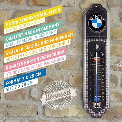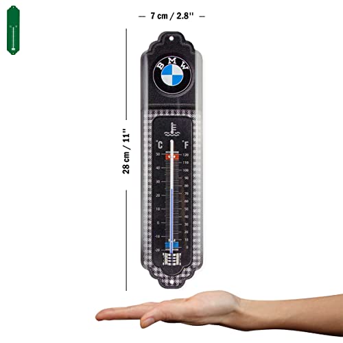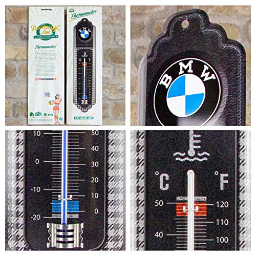 Stylish retro decor: It's this little metal sign in the shape of a thermometer. It measures 6.5 x 28 cm and has two pre-drilled holes for easy attaching to the wall. The attractive shape gives it something and a nice retro look. The curvature of the thermometer makes it look very plastic. In this decorative shape, it is applied indoors, thus decorating apartments, winter gardens, amateur Spaces, etc.