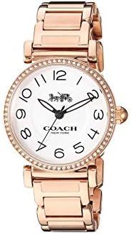 Rose gold tone stainless steel case, rose gold tone stainless steel bracelet. Fixed, crystal inlaid rose gold stainless steel frame. White dial with black hands and Arabic numeral hour scale. Dial type: Analog. Quartz movement. Scratch resistant mineral crystal. Pull/press the crown. Solid color case back. Case size: 32 mm. Case thickness: 7 mm. Round case. Waterproof depth of 30 meters /100 feet. Function: hours, minutes, seconds. Casual watch style. Coach Madison White dial Women's Rose Gold Watch 14502856.