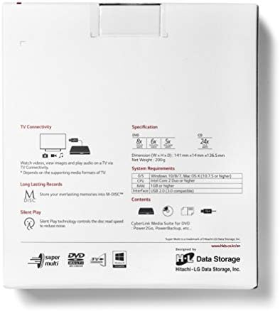 This ultra-portable, slim external DVD drive/burner GP57EB40 weighs just 200 grams thanks to its simple and lightweight design. This stylish rewriter burns all standard DVD and CD formats and also has M-Disc support for 1,000 years of data security. It offers fast 8x DVD-R read and write speeds and 24x CD-R read and write speeds. The power supply is only supplied through the USB interface, no AC adapter is required, making the device more versatile. You can connect the player to your TV, digital photo frame, or computer, and it is compatible with Windows 10 and Mac OS. Silent Play and Jamless Play technology ensures that the disc plays quietly and smoothly. The product dimensions are 144 x 135.5 x 14 mm. Includes software.