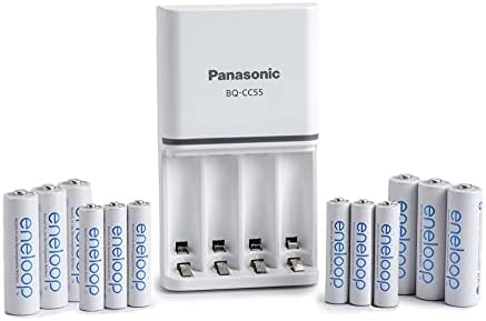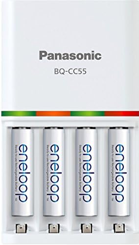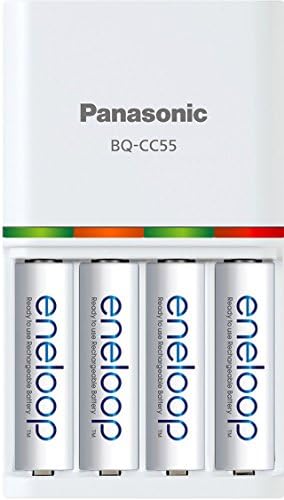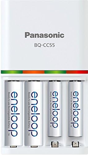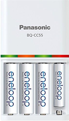 The Panasonic eneloop K-KJ55MBS66A includes 6 AA and 6 AAA (2100 cycle) eneloop batteries (battery color may vary), and a Panasonic 3 Hour quick charger BQ-CC55 eneloop ni-mh, low Self discharge batteries utilize Panasonic advanced rechargeable battery technology allowing them to be recharged up to 2100 times. eneloop battery cells deliver consistent power performance, maintain 70% of their charge for up to 10 years, come pre-charged (at the factory) using solar power and are ready to use out of the package. These eneloop cells also have increased storage life and extreme temperature performance down to -4 degrees Fahrenheit. The New BQ-CC55, 3 Hour Ni-MH battery charger delivers advanced, individual cell charging capabilities. Ideal for use at home, in the office, or on the road, this Panasonic CC55 charger is a convenient way to recharge any combination of up to four AA or AAA Ni-MH eneloop, eneloop Pro, or pro Ni-MH rechargeable batteries. The advanced eneloop quick charger features 4 LED charge indicator lights; 80-100% charged - Green, 20-80% charged,- Orange, and 0-20% charged - red. The charger also features a retractable AC plug.